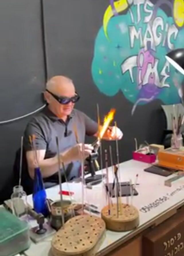 A man with glasses is working at a table, using a small torch to melt glass rods. There is a mural behind him with the words "It's Magic Time". The table has various tools and materials including glass rods, metal tools, and wooden holders. The man is using the torch to heat the glass rods until they are molten, and then shaping them. He is wearing safety glasses to protect his eyes from the bright light of the torch.