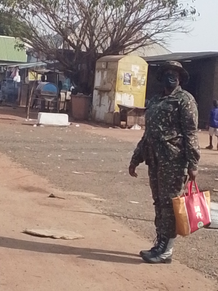The image displays an outdoor street or market scene in Dungu, Ghana, under clear daylight. The ground consists of unpaved, reddish-brown dirt with scattered debris, including a flat, light-colored object in the left foreground. A lone individual, positioned right of center, stands facing generally left with their head slightly rotated towards the viewer. They are dressed in a full camouflage uniform, comprising a patterned long-sleeved top, matching trousers, and a wide-brimmed camouflage hat. A black face covering obscures their lower face. They wear dark and light-colored tactical boots. In their right hand, held at their side, is a tan and red reusable shopping bag featuring white text or a graphic. The background includes several structures and vegetation. A prominent, large, deciduous tree with numerous bare branches stands centrally. To the tree's right is a tall, yellow, rectangular kiosk, covered with multiple affixed papers or posters. To the left of the tree, several market stalls or makeshift structures are visible, including one with a green roof and another containing a large, blue, cylindrical object on wheels. Dark containers are also present. In the far-right background, a person wearing a blue shirt and light-colored shorts is partially visible. Strong shadows indicate direct sunlight.