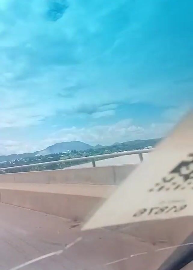 The video, taken from inside a moving vehicle, shows a highway bridge with a view of distant mountains under a sky of scattered clouds