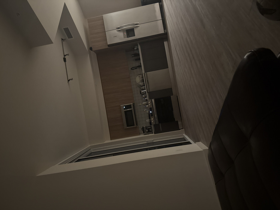 This image displays the interior of a modern, open-concept residential unit, likely an apartment or condominium, situated in Miami, United States of America. The scene is characterized by dim artificial lighting. In the immediate foreground, a dark-colored, tufted furniture piece, possibly a leather sofa or ottoman, is partially visible at the bottom left. To the left, a cream-colored wall forms a corner, adjoining a tall, dark-framed sliding glass door, behind which vertical blinds are discernible. The background features a kitchen area. It is equipped with light wood-grain upper cabinets and dark gray lower cabinets, contrasted by a light-colored countertop and a white tiled backsplash. Appliances include a stainless steel microwave oven mounted above a stainless steel range with a black stovetop and a blue digital display. Adjacent to the range is a stainless steel dishwasher, and further right, a large, silver side-by-side refrigerator with an external ice and water dispenser. Various kitchen items, such as pots, bowls, and a coffee maker, are present on the countertop. A black gooseneck faucet is visible above the sink area. The ceiling is white and features a track lighting fixture with multiple spotlights, as well as an air vent. The floor throughout the visible space is covered with light-colored, wood-look plank flooring. No individuals are present in the image, and no active actions or interactions are depicted. The scene appears static and unoccupied.
