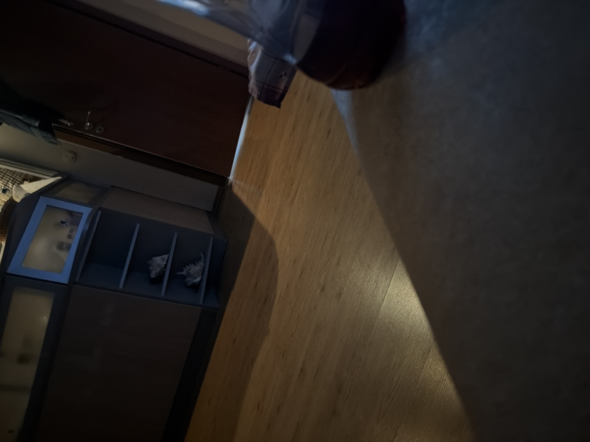 The image depicts a dimly lit interior space. In the foreground, there is a hardwood floor with a noticeable line of light across it. A dark cabinet with compartments is visible in the lower left of the frame. Shells are placed in two of the compartments. In the upper left corner is a glimpse of a dark door or cabinet. The top of the image contains an out-of-focus object. The image does not provide enough information to identify the location as Pleven, Bulgaria.