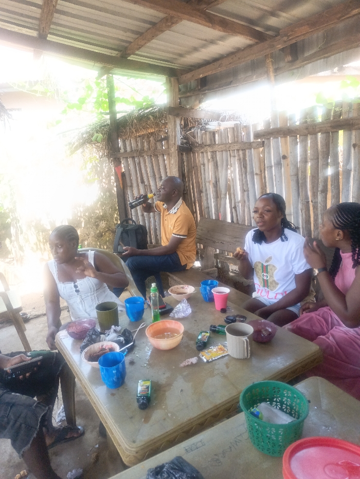 A group of five individuals is observed gathered under an open-sided, rudimentary structure in Akwanga, Nigeria, likely for a meal or social event