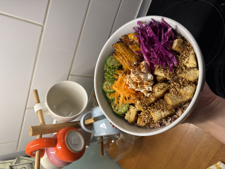 - "A person holds a bowl filled with various foods, including sliced cucumbers sprinkled with sesame seeds, grilled corn, shredded purple cabbage, shredded carrots, a dollop of cream, and tofu cubes with sesame seeds" by FM-KwP182, licensed under CC BY 4.0