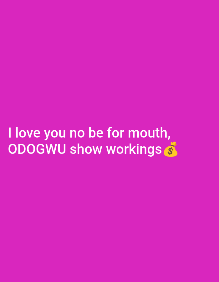 The image displays white text against a solid magenta background. The text, rendered in a sans-serif font, reads "I love you no be for mouth, ODOGWU show workings" across two lines. A single gold money bag emoji (💰) is positioned directly after the word "workings" on the second line. The image is a graphical composition of text and an emoji; it does not visually depict a physical scene, individuals, objects, actions, interactions, or an environment in the city of Zawan, Nigeria, or any other specific location.