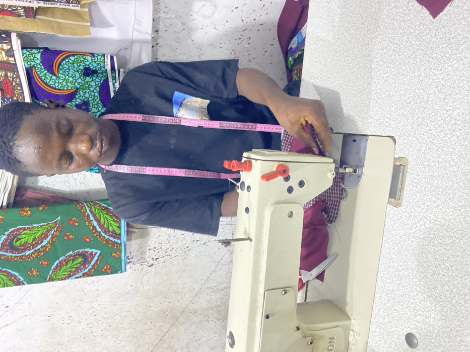 An adult male is observed operating an industrial sewing machine in a tailoring workshop in Tawpo, Nigeria