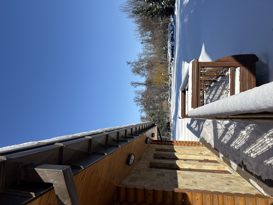 The image depicts a winter scene in Novi Petrivtsi, Ukraine, characterized by abundant snow and clear skies. The perspective is from a slightly elevated position looking outwards. In the left foreground, the exterior wall of a building is visible, constructed with a lower section of horizontal timber logs and an upper section of light-colored, textured stone blocks. Three oval-shaped outdoor light fixtures are mounted on the stone wall. Above, a wooden soffit extends under a dark metal roof structure, from which numerous icicles hang along the eaves. To the right, a dark brown wooden railing, likely part of a porch or deck, extends into the midground. The top surface of this railing is covered with a thick, smooth layer of white snow. Intricate black wrought iron scrollwork adorns the lower section of the railing. The ground immediately adjacent to the building is covered in snow, with a partially cleared or well-trodden path visible. Strong shadows, cast by the railing and the building, stretch across the snow-covered ground, indicating direct sunlight. Beyond the railing, the entire landscape is blanketed in undisturbed white snow, suggesting a park or open field. In the midground, numerous deciduous trees, bare of leaves, stand alongside several snow-laden evergreen trees. A single deciduous tree with distinct yellow or golden foliage is visible among the bare trees. The background features a clear, vibrant blue sky. No people or active interactions are visible within the scene.