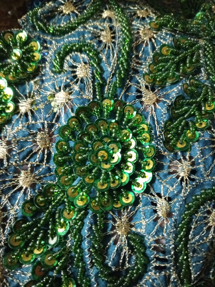 The image displays a detailed close-up of an elaborately embellished textile, located in the city of Phakeo, Laos. The primary surface consists of a teal-colored fabric. This fabric is adorned with intricate patterns formed by bright green sequins, small dark green glass beads, and gold-colored metallic embroidery thread. Dominant features include circular clusters of green sequins, each approximately 4-5mm in diameter, arranged in concentric circles, creating stylized flower or eye-like motifs. Emanating from and surrounding these sequin clusters are numerous strands of opaque, cylindrical dark green glass beads, forming flowing, organic, and feathery designs across the fabric. Interspersed and underlying these beaded and sequined elements is delicate embroidery crafted from gold-colored thread, forming web-like, starburst, or lattice patterns directly onto the teal base fabric. The combined elements create a dense, highly textured, and reflective surface. No individuals, specific actions, or broader environmental context are visible beyond the textile itself.