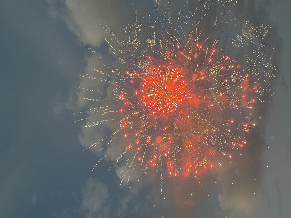 Against a cloudy twilight sky, a vibrant firework bursts in a radial pattern. The core is a fiery orange-red, fading outward into tendrils of glittering gold and white. Smaller bursts surround the central explosion. The firework's light illuminates the surrounding clouds, creating a smoky, diffused glow.