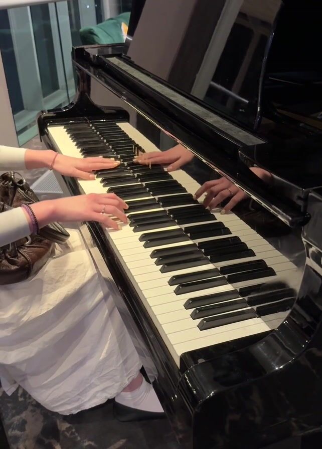 A woman wearing a long, light-colored skirt, white socks, and dark shoes is playing a black grand piano. Her hands, adorned with rings and a bracelet, are visible as they move across the black and white keys. A brown purse rests next to her on the piano bench. The piano has a glossy finish, reflecting her hands and the surrounding environment. Through a window behind the piano, a balcony and some greenery are visible. The floor appears to be patterned. The camera angle is slightly elevated, showing a close-up view of the woman and the piano.