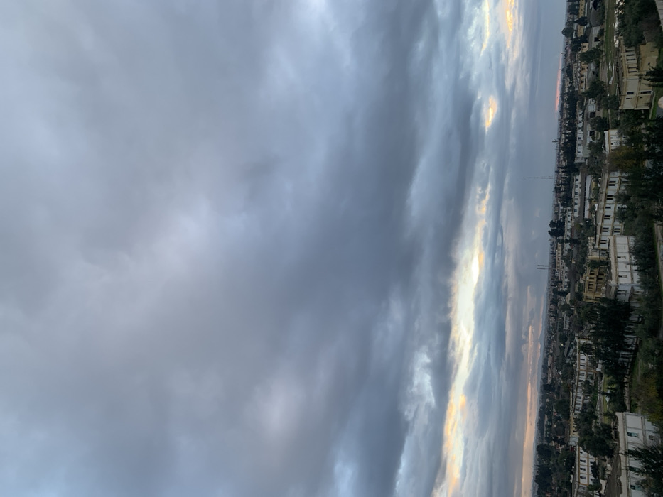 The image captures a landscape under a dramatic sky. Heavy, grey clouds dominate the majority of the view, suggesting an overcast day. A narrow band of light breaks through the clouds, creating a subtle contrast and hinting at the possibility of sunrise or sunset. On the right side, a cityscape emerges, featuring densely packed buildings and greenery, extending towards the horizon. The perspective is from an elevated position, providing a wide view of the scene.