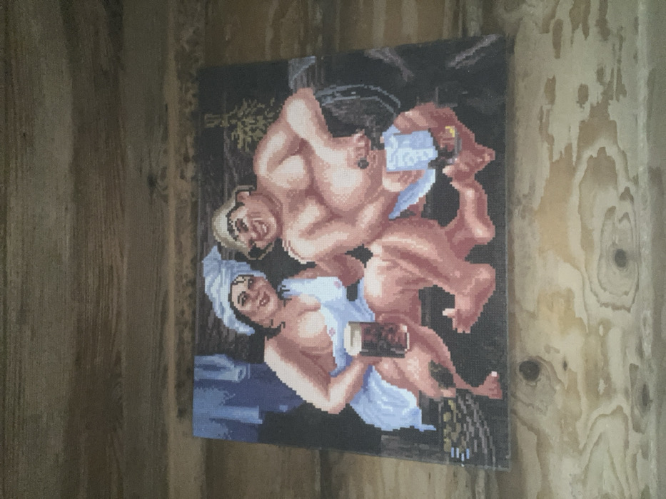 A pixel art image depicting two individuals in a banya-like setting is affixed to a light-brown wooden plank wall