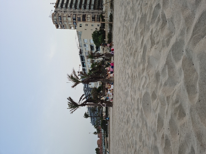 The scene depicts a sandy beach in Alicante, Spain, viewed from a low perspective towards the urban coastline