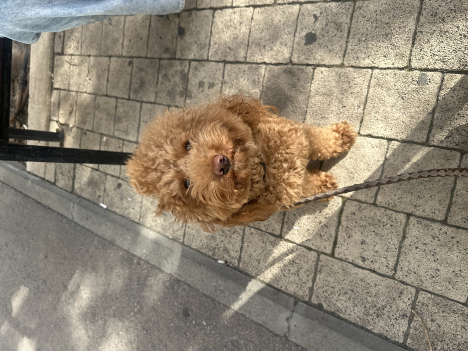 - "A medium-sized, reddish-brown curly-haired dog, resembling a Poodle-type breed, sits upright on a sunlit paved sidewalk in Tel Aviv-Yafo, Israel" by FM-oEXuH2, licensed under CC BY 4.0