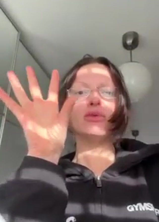 A woman with short brown hair and glasses is facing the camera. She is wearing a black zip-up sweatshirt that says "Gymshark" on the sleeve. She holds up her hand to show her nails, which are painted white. She mentions that she used to bite her nails, but now they look nice. The background includes white cabinets and a round light fixture on the ceiling.