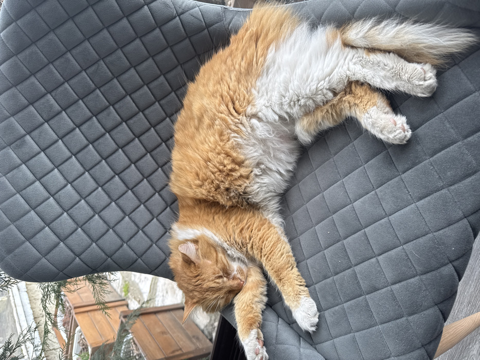 - "A fluffy, predominantly orange domestic cat with white markings on its chest, belly, and paws is depicted sleeping on its left side on a dark grey, diamond-quilted upholstered chair" by FM-Ecq252, licensed under CC BY 4.0