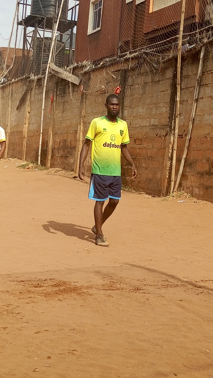 An adult male walks on a reddish-brown dirt ground in an outdoor, sunny environment within the city of Unknown, Unknown. He is dark-skinned, with short dark hair and a short beard, wearing a yellow-to-green gradient short-sleeved athletic shirt with "Dafabet" printed in white, dark blue athletic shorts with light blue panels, and light-colored athletic shoes. His body is angled towards the right, with his head turned slightly left, gazing forward. A distinct shadow extends to his left, indicating direct sunlight from the right. In the background, a low concrete block wall is topped with a tattered white netting system supported by vertical bamboo poles. Behind the wall, a brown corrugated metal building with one white-framed window is visible. To the upper left, a black water tank sits on a metal scaffold structure. A partial view of another individual's left arm and yellow sleeve is present on the far left of the frame.