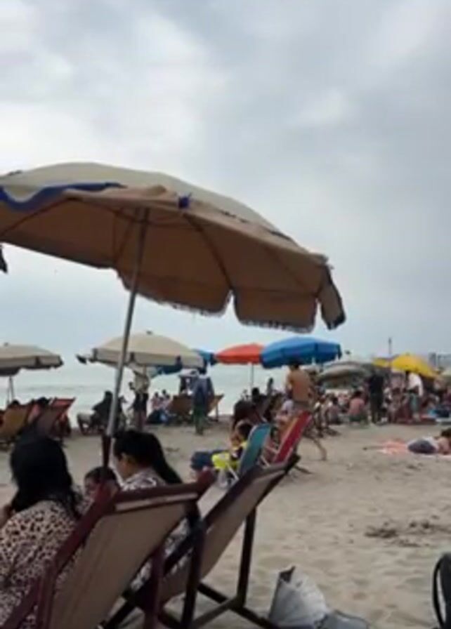 The video depicts a crowded beach under an overcast sky