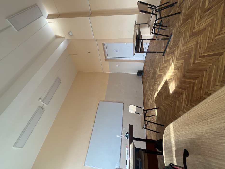 This image depicts an unoccupied classroom or educational space in Voysil, Bulgaria. The room features a two-tone wall scheme, with the upper sections painted light peach and the lower sections a lighter, off-white or beige, showing signs of wear and discoloration. The ceiling is white with visible structural beams and multiple rectangular LED light fixtures, along with a circular smoke detector. The floor is covered in a light to medium-toned wooden parquet, laid in a herringbone pattern. Sunlight streams into the room, casting distinct rectangular bright patches onto the floor. Furniture includes three desks and at least three chairs. In the foreground, a light-wood-topped desk is partially visible on the left. Further back on the left, another desk with a dark top supports a clear pump bottle (likely hand sanitizer) and other small, indistinct objects, with a light-wood-and-black-metal chair positioned in front of it. On the right side of the room, a third desk with a light wooden top and a black metal frame is present, accompanied by two light-wood-and-black-metal chairs, one placed next to the desk and another stacked behind it. A large, rectangular white board is mounted on the left wall. A closed white door with some text affixed to it is visible on the right wall, near a black trash can positioned in the corner. No individuals are present in the scene.