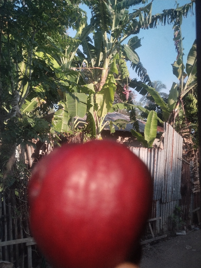 The image presents an outdoor, static scene located in the city of Pie, Indonesia. No people are visible. The immediate foreground is occupied by a large, spherical, out-of-focus red object, obscuring the lower central portion of the background. Behind this, the midground displays dense tropical vegetation under a clear blue sky. Multiple banana trees with broad green leaves are prominent, featuring bunches of unripe green bananas and a reddish-purple banana blossom hanging from a central tree. Other leafy green trees are also present, particularly on the left. Partially visible structures include a dark, low-pitched roof in the center-left background, and a weathered fence or wall constructed from corrugated galvanized iron sheets to its right, exhibiting signs of rust. A rough wooden slatted fence is discernible on the far left. The visible ground beneath the structures appears to be an unpaved dirt path. The entire scene is brightly illuminated by natural daylight.