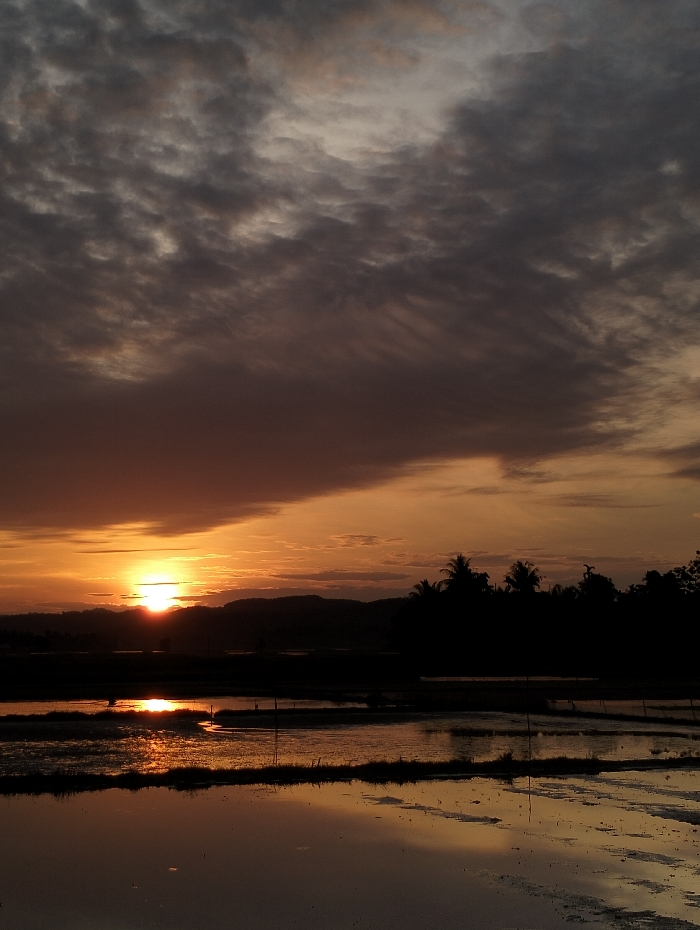 A vivid sunset paints the sky with hues of orange and gold, partly obscured by dark, textured clouds. The sun's reflection shimmers across flooded rice paddies in the foreground. Silhouetted trees and a distant mountain range create a dark backdrop, contrasting with the bright horizon. Thin, vertical poles stand in the water, adding depth to the scene. The overall impression is one of tranquil beauty and natural harmony.