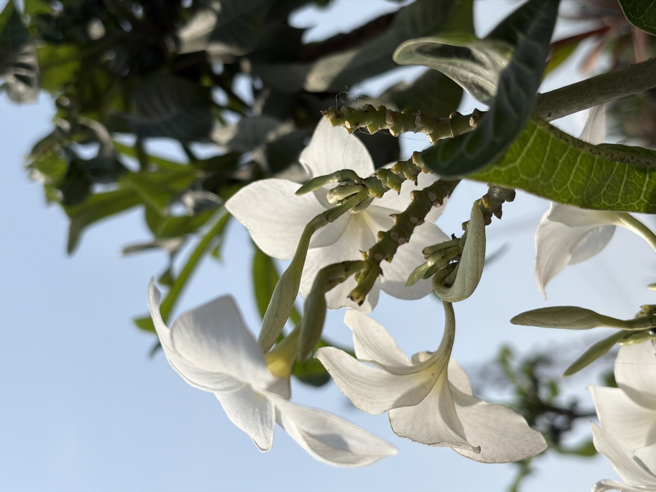 The image displays a close-up, low-angle perspective of several white flowers and their associated plant structures against a clear, light blue sky. The primary subjects are multiple white flowers, consistent with Plumeria (Frangipani) blossoms, each featuring five petals that appear slightly translucent due to direct sunlight. Some flowers exhibit a subtle yellowish hue in their central throat. The flowers are attached to thick, green, succulent-like stems, which show distinct nodes and small, pointed protuberances. Various buds in different stages of development are also visible on these stems. Green foliage, characterized by broad leaves with discernible venation, occupies the upper right background and lower foreground, with some elements slightly out of focus. The environment is an outdoor setting, under a bright, cloudless sky, located in Jakande, Nigeria. No people, animals, or man-made objects other than the plant material are present in the frame.