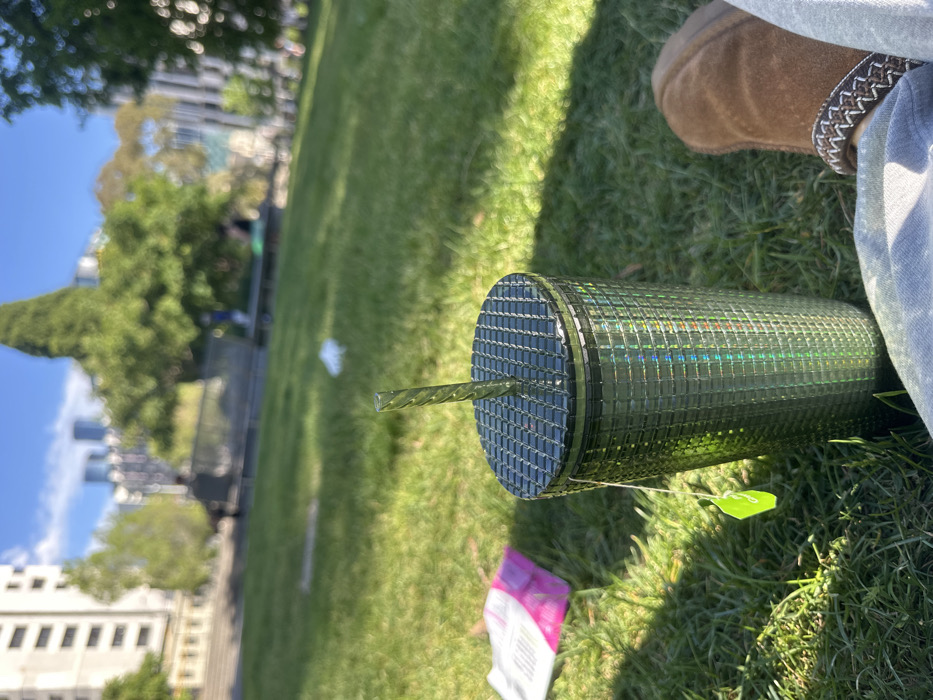 The image depicts an outdoor scene within a park in Carlton, Australia, under bright sunlight. In the foreground, a large, dark green iridescent tumbler with a textured, grid-patterned surface rests on green grass. A clear, spirally ridged green straw protrudes from its matching lid, and a bright green rectangular tea bag tag, attached by a string, hangs from the tumbler's left side. To the right of the tumbler, a person's lower leg and foot are visible, clad in light-colored denim trousers and a brown Ugg-style slipper featuring a patterned knitted cuff. A crumpled pink and white wrapper lies on the grass to the left of the tumbler. The midground consists of a sunlit green lawn with scattered shadows. The background reveals a blurry urban park landscape with multiple trees, including a tall, conical evergreen. Distant high-rise buildings and a prominent light-colored, multi-story building are visible against a clear blue sky. Several indistinct human figures are present further back in the park.