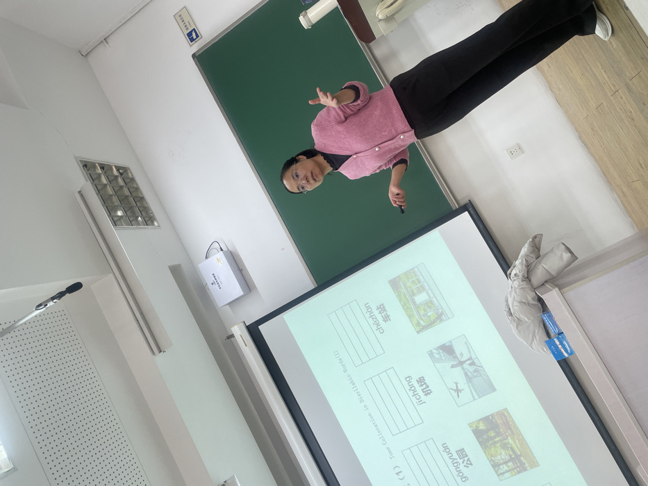 - "A woman wearing a pink cardigan and dark pants stands in front of a classroom screen and points at the displayed content" by FM-k4z3A2, licensed under CC BY 4.0