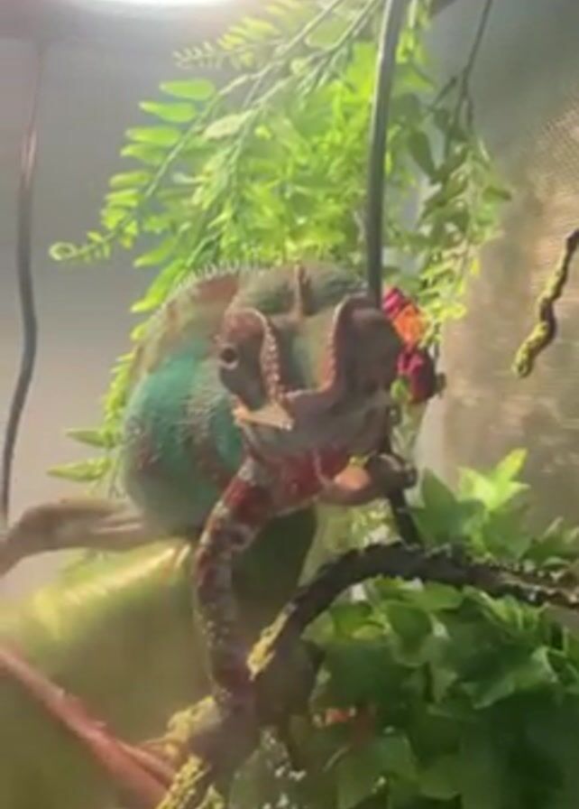 chameleon in a terrarium. The chameleon has a blue-green back and a reddish-pink front. It is standing on a branch and grasping a thin, black vertical support with its front feet. The terrarium contains artificial green plants, branches, and flowers. A light fixture is visible above. Mist is also seen in the terrarium.