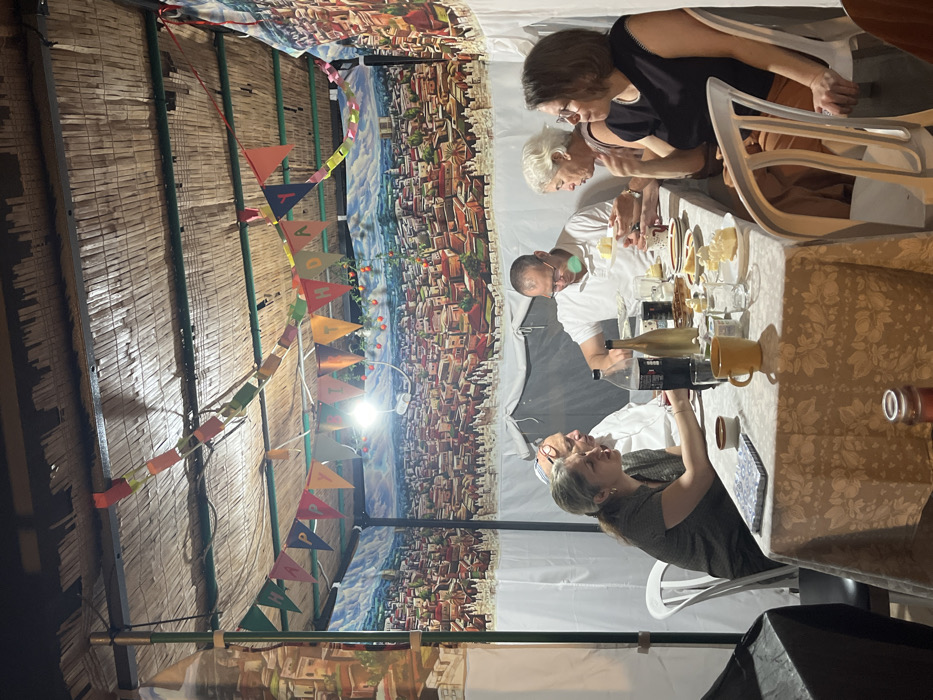 The image depicts six individuals gathered for an evening meal or social event inside a Sukkah in Kfar Saba, Israel