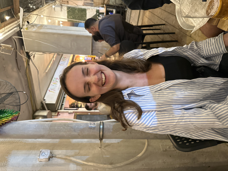 A young adult female, with long brown hair, is seated in the foreground, facing the camera and smiling broadly with her eyes closed. She is wearing a light blue and white striped button-down shirt over a black top. To her immediate lower right, a glass mug containing a golden liquid, likely beer, rests on a wooden table, partially obscuring a paper or menu. In the mid-ground to the left, a light-colored vertical pillar features a white electrical outlet with two corrugated conduits extending downwards, and a small QR code sticker is visible. In the background, other patrons are seated at tables; a male with a beard and dark shirt is visible to the right, and another male in a light shirt is partially visible to the left. Overhead, a ceiling fan and string lights are present, along with green decorative elements and exposed wiring. A sign displaying "FRIENDS" in colorful letters and another sign reading "TREATS" are visible above the background patrons. The scene depicts an indoor or covered outdoor area of a casual commercial establishment, likely a bar or restaurant, located in the city of Be’er-Sheva, Israel, under artificial lighting conditions.