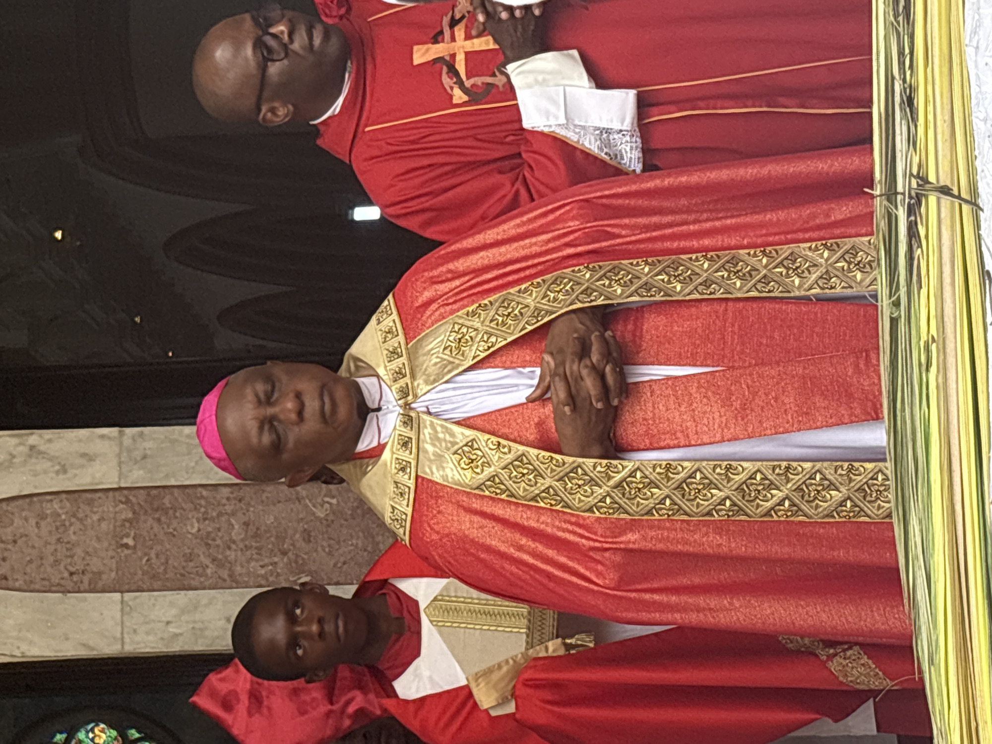 three individuals in religious attire. The central figure is an older man wearing a red and gold cape over a white robe, with a pink zucchetto on his head. His hands are clasped. Above him is a bald man wearing glasses, in a red robe with a gold cross emblem, also with his hands clasped. Below the central figure is a younger man in a red and white robe. All three appear to be within a church or religious building. The presence of palm fronds on the right side of the image suggests a Palm Sunday celebration. The location is likely in Lagos, Nigeria, given the presence of people and cultural elements consistent with that region.