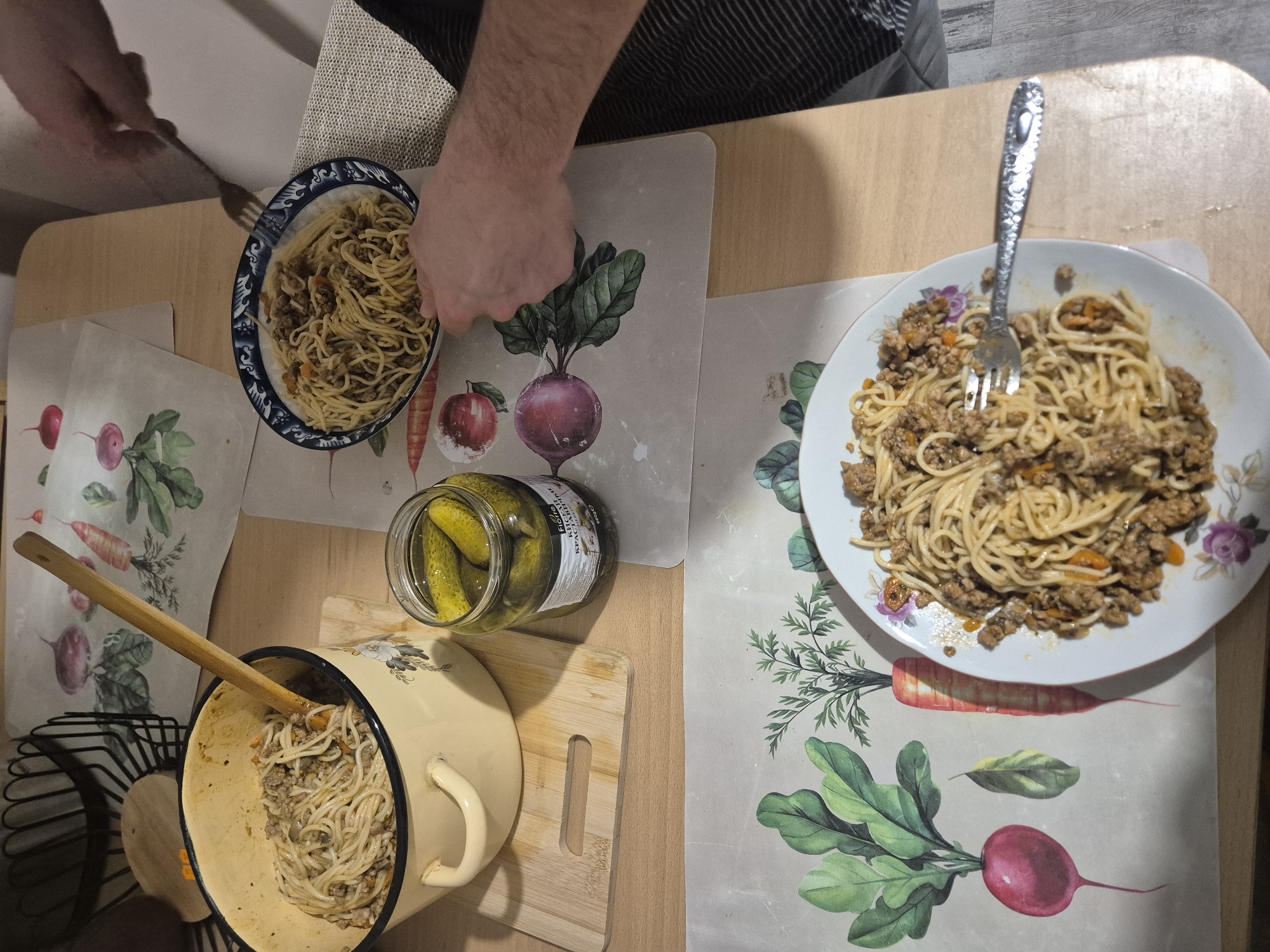 A top-down view shows a table setting with two plates of spaghetti with meat sauce, a pot of spaghetti with meat sauce, and a jar of pickles. The table is covered with placemats depicting vegetables like radishes, carrots, and beets. A person is seated on either side of the table, each holding a fork. One person appears to be serving themselves from the pot. The scene is likely indoors. The location in Pavlikeni, Bulgaria, is speculative, as the image provides no direct evidence of the city.