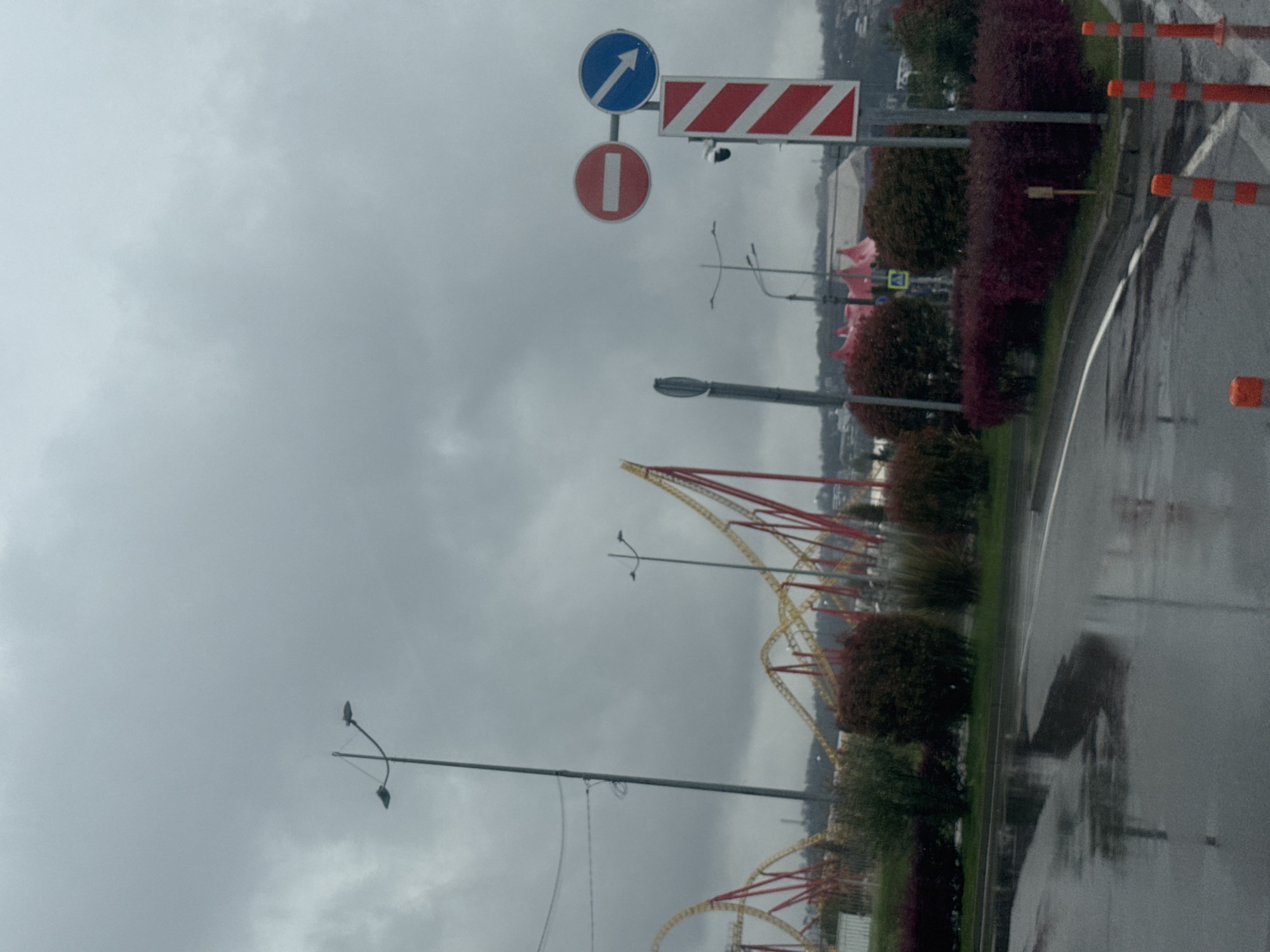 The scene is outdoors, on a wet road next to a sidewalk or curb in Sirius, Russia. The weather is overcast, with a grey sky. A red and yellow roller coaster is visible in the background. Various road signs, including a blue "direction" sign, a red "no entry" sign, and a red and white striped sign, are present. There are dark green and reddish bushes lining the road. Orange traffic cones are visible on the far right. Streetlights are present along the road. The road surface reflects the grey sky.
