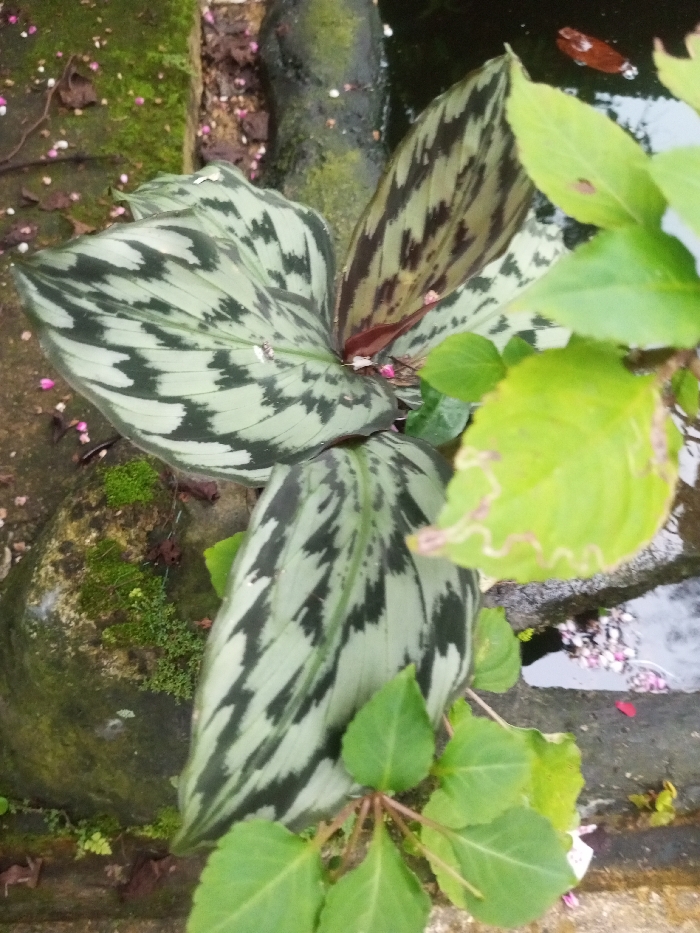 An overhead, close-up photograph captures a section of a garden or outdoor area in Tecuci, Romania. The central elements are multiple large, ovate leaves exhibiting a striking patterned variegation of light greenish-gray and dark green/black. One prominent leaf is oriented diagonally in the lower left-center. Surrounding these plants are moss-covered, irregularly shaped stones or concrete elements, with small patches of vibrant green moss and groundcover. The adjacent ground surface is strewn with small, fallen pink and white flower petals. To the right, a dark body of water, likely a pond, is visible, its surface reflecting light and supporting scattered pink and white petals along with a single reddish-brown piece of organic matter. A separate plant with clusters of solid bright green leaves partially frames the right side of the composition; one of these leaves features a light, serpentine trail mark. No human figures or active subjects are present.