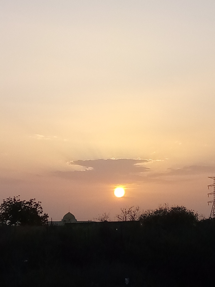 The image displays a landscape scene in Las Barrancas, Venezuela, at either sunrise or sunset. The sky occupies the upper two-thirds of the frame, exhibiting a color gradient from light orange-yellow near the horizon to a pale beige overhead. A bright, circular yellow-orange sun is positioned in the lower mid-right quadrant of the sky, with scattered clouds present, including a more substantial, elongated cloud formation horizontally above the sun. The lower third of the image is comprised of a dark silhouette of the horizon. On the left, dense tree foliage is visible. Centrally, a dome-shaped building is silhouetted against the lighter sky. Towards the right, sparse, bare tree branches and another mass of dark foliage are present. A partial view of a metal lattice transmission tower is visible on the far right edge of the frame, extending upwards from the horizon line. No human figures or discernible animal life are depicted, and no specific actions or interactions are occurring.