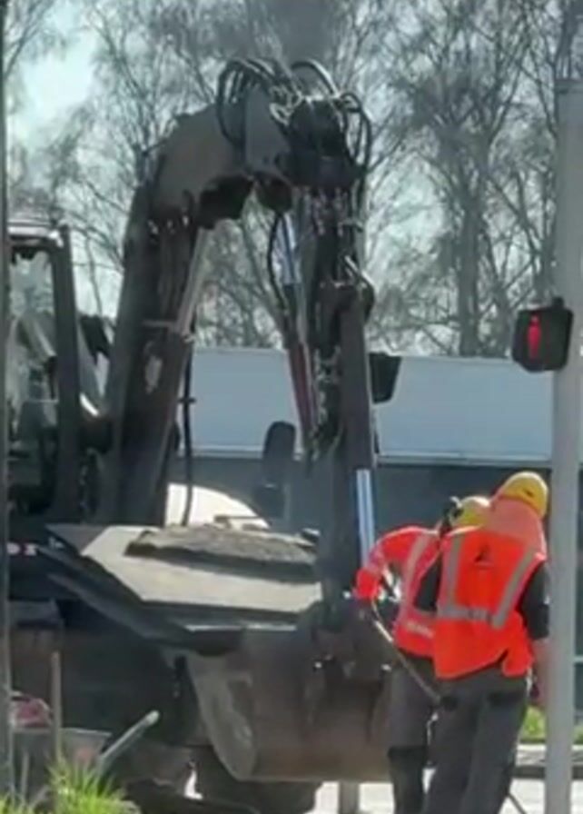 construction scene in what appears to be a European urban area. Two construction workers wearing yellow hard hats and orange safety vests are working on the side of the road near a pedestrian crosswalk signal displaying a red walking person. One of the workers is holding a broom, and the other has a long-handled tool, possibly a shovel or scraper. Behind them, a large construction vehicle, seemingly a backhoe, sits idle with its arm raised. The area around the workers has been disturbed, with dirt and debris visible. The background includes trees without leaves, a white building, and possibly other traffic. The day appears sunny.