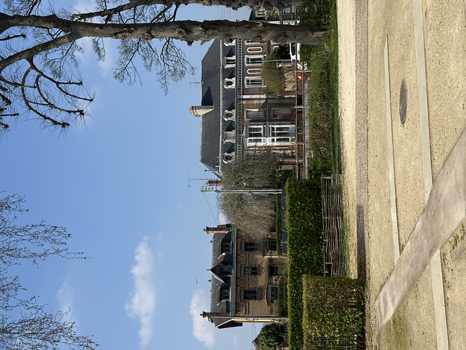 The image displays an outdoor scene in Beauvais, France, under a clear blue sky with scattered white clouds. The foreground consists of a light brown gravel surface, interspersed with intersecting flat concrete strips, possibly indicative of a recreational court. A circular metal manhole cover is visible within this area. Immediately beyond, a well-maintained, dense green hedgerow runs horizontally across the frame, with a section of woven wattle fencing positioned behind it. Behind the hedgerow, a paved road is visible, with a white car partially discernible on the right, facing left. The mid-ground and background are dominated by two large, multi-story residential buildings. The structure on the left is a reddish-brown brick house with multiple dark-framed windows, a steep dark roof featuring dormer windows, and multiple chimneys. Its facade includes a distinctive gabled section. To its right, a larger, darker red-brown brick building stands prominently, characterized by a dark mansard roof with several oval-shaped dormer windows and a multi-pane bay window extending from its front facade. Both buildings feature architectural styles consistent with early 20th-century French urban residences. Utility poles and various antennas are visible against the sky between and above the structures. Bare, deciduous tree branches, likely pollarded, frame the upper left and right sides of the image, suggesting late winter or early spring. No individuals are present in the scene.