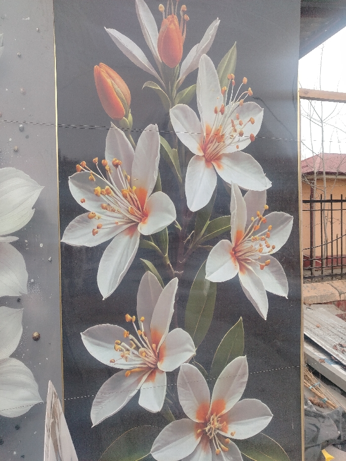 The image depicts a vertical arrangement of decorative panels, presumably installed outdoors in Balykchi, Uzbekistan. The dominant central panels showcase an artistic rendition of white flowers with prominent orange-yellow stamens and pistils, alongside two closed orange flower buds, all set against a dark grey or black background with green leaves. Faint horizontal seams delineate individual panels. To the left, a thin gold-colored vertical strip separates these from a partially visible panel featuring lighter floral elements on a grey background, accented with small gold-colored dots. The right side of the image reveals an outdoor environment under an overcast, light grey sky. Bare deciduous trees with slender branches are visible in the mid-ground, beyond a black metal fence with vertical bars. A light orange-brown building with a dark roof is partially observable behind the fence. In the immediate foreground to the right, an accumulation of debris includes corrugated metal sheets, bundles of thin sticks or branches, and other unidentifiable refuse on a rough ground surface. The scene is consistent with a residential or semi-urban area in Balykchi, Uzbekistan. No individuals are present.