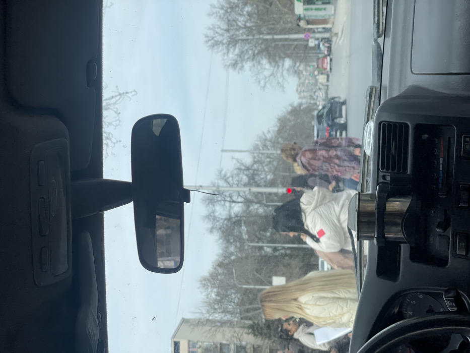 The image presents a street-level view from the interior of a vehicle on an overcast day in Plovdiv, Bulgaria. **Vehicle Interior (Foreground):** The shot is framed by the vehicle's dashboard, visible at the bottom. A black steering wheel is partially seen on the far left. The instrument cluster and central air vents are discernible. A black plastic cupholder, containing a metallic insert, is mounted on the dashboard towards the center. The rearview mirror hangs centrally from the vehicle's headliner, with a thin dark wire extending downwards from its base. The headliner itself is light-colored and features an overhead light console. The windshield appears to have minor smudges or dust. **Street Scene (Midground to Background):** The external scene depicts an active urban street or intersection. Approximately five individuals are visible in the midground, appearing to be pedestrians either crossing or waiting to cross the street. - On the left, a woman with long blonde hair, wearing a cream-colored quilted jacket, stands holding white papers. - To her right, a woman with long dark hair, dressed in a white hooded jacket with a small red rectangular patch on her upper left arm, holds a dark object (possibly a smartphone) with a small red dot of light emitted from it. - Further right, a woman with light brown, wavy hair wears a multi-colored patterned coat in shades of purple, red, and brown as she walks towards the right side of the frame. - Other blurry figures are visible behind these individuals. In the background, a multi-lane road is visible with vehicular traffic. A dark-colored SUV is observed in the right-center of the frame, moving or parked on the street. Several other vehicles are visible further down the road. The street is lined with numerous bare deciduous trees, indicating a cold season (late autumn, winter, or early spring). Streetlights and utility poles are interspersed among the trees. A red traffic light signal is faintly visible in the distant background, partially obscured. **Buildings and Environment:** On the far left, a multi-story, light-colored building with visible balconies on its upper floors and commercial spaces at ground level is present. On the far right, a commercial building houses a shop with a distinct green facade, identified by Cyrillic text as "АПТЕКА" (Pharmacy). The sky is uniformly overcast, contributing to a muted light quality. **Location:** The scene depicts an unidentified urban street or intersection within the city of Plovdiv, Bulgaria. The presence of Cyrillic signage (specifically "АПТЕКА") and the general architectural style are consistent with a Bulgarian urban environment. No specific street names or unique landmarks are discernible to pinpoint the exact location within Plovdiv.