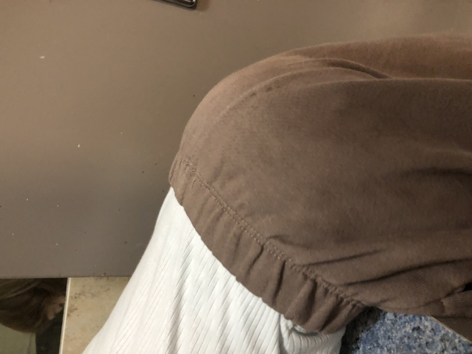 The image captures a close-up, downward-angled perspective of an individual's lower torso and upper legs, located in the city of Saverne, France. The subject is wearing a white, ribbed long-sleeved top and light brown, elasticated casual trousers or sweatpants. The upper edge of the brown garment exhibits prominent stitching and gathered fabric consistent with an elasticated waistband. In the upper left background, a partial reflection of an individual's head, showing light brown hair, is visible in a vertical, reflective surface, likely a mirror. Adjacent to and below this reflection, a light beige, mottled horizontal surface is present, resembling a countertop or vanity. The dominant background element is a plain, light brown wall surface, which displays several small, irregularly dispersed white flecks. A section of dark blue, textured fabric is visible in the lower left quadrant of the frame, positioned beneath the subject's left side. The individual's visible posture indicates a forward lean or a downward gaze.
