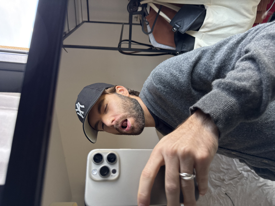The image depicts an adult male taking a mirror selfie indoors in the city of Unknown, Unknown. The man is reflected from the chest up, holding a light-colored smartphone with a triple-lens camera array in his left hand. He wears a black baseball cap with a white "NY" logo, a dark t-shirt, and a grey V-neck cardigan. A silver-toned, multi-band ring is present on his left ring finger. His right eye is closed in a wink, and his mouth is open with his tongue slightly extended. The background reflection reveals an indoor setting with light-colored walls. To the man's left, a portion of a bed with white bedding is visible. To his right, a black metal clothing rack holds various garments on hangers and several bags, including black crossbody styles and cream-colored canvas tote bags. A dark window frame and bright natural light are visible in the upper background.