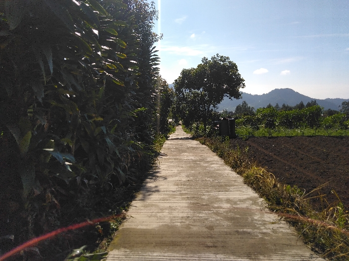 The image captures an outdoor scene in Ban Lao Ta, Laos, under bright daylight. A narrow, light gray concrete path extends from the foreground into the background, curving gently to the left. On the left side of the path, a dense wall of dark green, broad-leaved vegetation, possibly a hedge or crop, stands tall, casting shadows across sections of the path. A faint red linear object is partially visible on the ground in the lower-left corner. On the right side of the path, an area of dark brown, tilled earth is present, bordered by patches of dry, light-brown grass. Further into the mid-ground on the right, a large green tree with a full canopy is visible, alongside a dark, rectangular utility box or structure. Beyond these, rows of smaller green trees or shrubs extend into the distance. The background features undulating, vegetated hills or mountains under a clear, light blue sky with scattered wispy clouds. No individuals are present in the depicted scene.