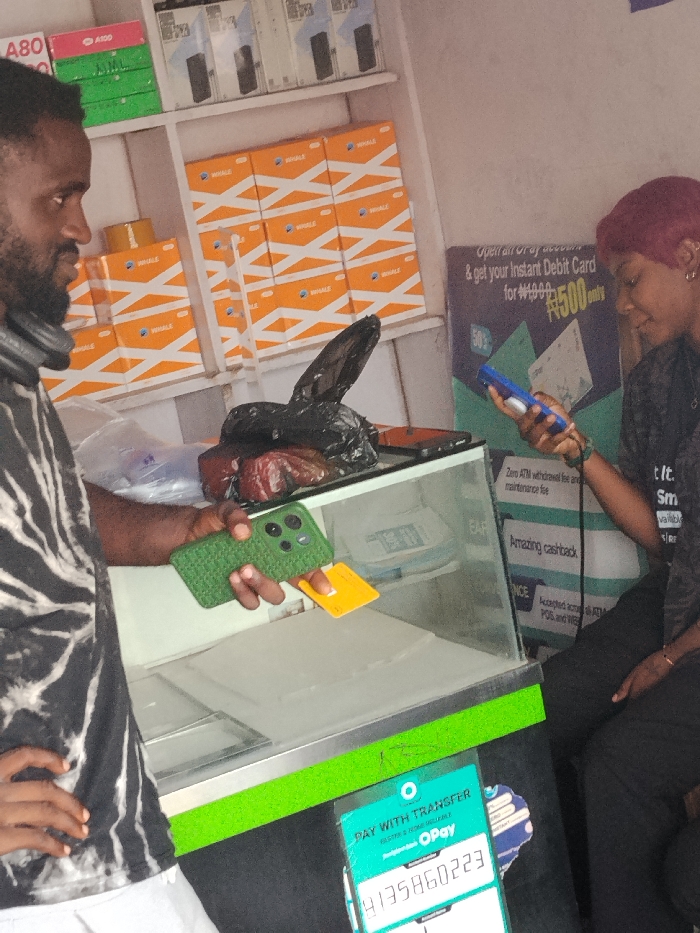The scene depicts an interior view of a small retail establishment, consistent with a mobile phone or agent banking outlet in Fagge A, Nigeria. The precise street or specific address within Fagge A is not discernible from the image. Two individuals are present. On the left, a male subject with dark skin, a beard, and short dark hair stands, facing right. He wears a black and white tie-dye t-shirt and white shorts. Headphones are worn around his neck. He holds a green smartphone, equipped with a triple camera array, in his right hand. A small yellow card is held beneath his thumb against the phone. On the right, a female subject with dark skin and short reddish-purple hair is seated, facing left. She wears a dark patterned top and dark pants. She holds a blue handheld device, likely a mobile Point of Sale (POS) terminal or feature phone, in both hands, looking down at it with a slight smile. A green band or bracelet is visible on her left wrist. A glass-topped display case with a neon green trim runs horizontally between the two individuals. On top of the display case, behind the male's hand, are a black plastic bag and other indistinct items. Below the display case, a green and white sign indicates "PAY WITH TRANSFER OPay" and displays a bank account number starting with "9135860223." The background features white shelves stocked with various products. The top shelf contains boxes labeled "A80" and "A100," along with other electronics packaging. The middle and lower shelves hold multiple identical orange boxes branded "WHALE" with a white diagonal stripe pattern. A blue and white poster on the right wall advertises OPay services, including instant debit cards for N1500, zero ATM withdrawal fees, and cashback options. The walls are light-colored. The interaction appears to be a commercial transaction or service engagement.