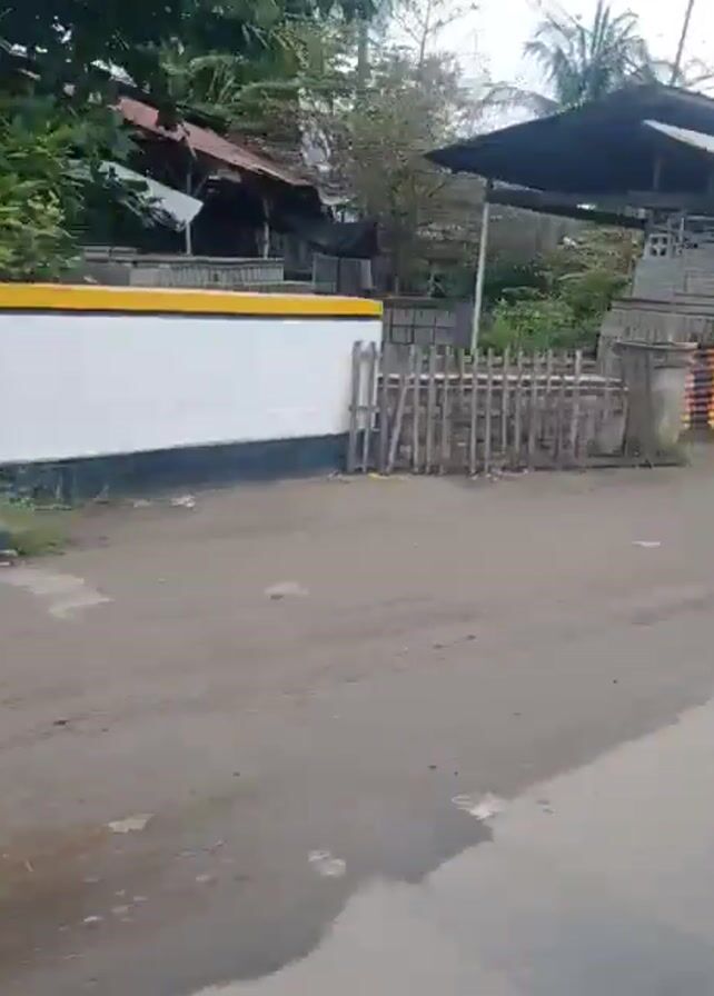 first-person perspective from a moving vehicle on a paved road. The roadside features diverse elements: vegetation, including trees and banana plants; structures like a partially visible building with corrugated metal siding and concrete blocks; and a concrete utility pole. A motorcycle passes in the opposite direction. The video is shaky due to the movement of the vehicle.