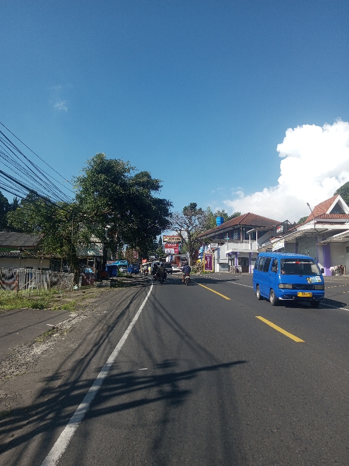 The image displays a sunlit street scene within the city of Niz Lakuk, India. The central feature is an asphalt road, marked on its left edge by a solid white line and featuring double intermittent yellow lines in the center, delineating two traffic lanes. To the immediate left of the road is a dirt and gravel shoulder. Elongated shadows from unseen objects to the left are cast across the road and shoulder, indicating direct sunlight. Along the left side of the street, a sequence of low-rise buildings with varied designs and tiled roofs is partially obscured by substantial green trees and dense foliage. Numerous overhead utility cables are visible spanning the upper-left portion of the frame. Further along this side, a large vertical billboard bearing the 'JOTUN' logo is noticeable. Multiple motorcycles, some with operators, are observed on the left lane, moving in the direction away from the viewer. On the right side of the road, a blue van, resembling a compact passenger or cargo model, is in motion, receding from the viewpoint. It displays a yellow license plate and several decals on its front passenger window. Behind this vehicle, structures including a multi-story building with a brown tiled roof and a purple and white façade are present, along with another building exhibiting a similar roof design. The sky above is largely clear and blue, with a prominent white cloud formation situated in the upper-right area of the image.
