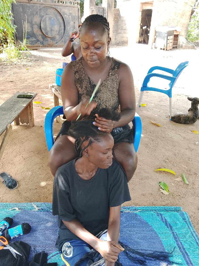 An outdoor scene in Unknown, Unknown, depicts two adult females engaged in hair braiding on unpaved reddish-brown ground