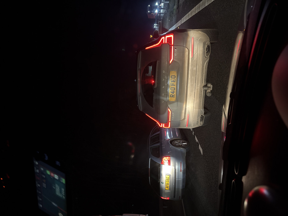 The image depicts a nighttime scene of stationary vehicle traffic on a multi-lane motorway, likely the M11 within the Uttlesford district of the United Kingdom. The viewpoint is from inside a vehicle, looking forward through the windshield, with part of the dashboard visible at the bottom. In the immediate foreground and centered is the rear of a grey Volvo XC60 SUV, bearing the UK registration plate 'R40 FEO'. The vehicle's red rear lights are illuminated, and it features a tow hitch. Its exterior appears moderately dirty. To the left of the Volvo and slightly further back is a silver Skoda Octavia Estate with the UK registration plate 'AF61 SBZ'. This vehicle is also stationary in an adjacent lane, with its rear lights illuminated. Distant vehicle lights, including red taillights and brighter headlights, are visible further along the road, indicating additional traffic. On the far right, faint illumination suggests a barrier or embankment. In the upper-left portion of the frame, a digital display screen, likely an in-car navigation or information system, is illuminated with various graphical elements in green and blue, casting a soft glow. No individuals are visible in the scene.