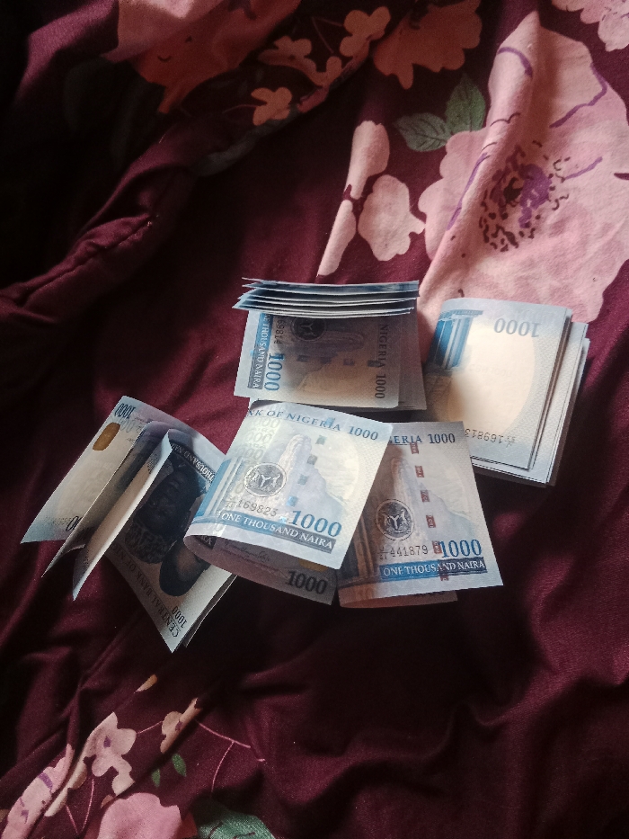 Several stacks of Nigerian Naira banknotes, specifically 1000 Naira denominations, are scattered on a maroon floral-patterned fabric