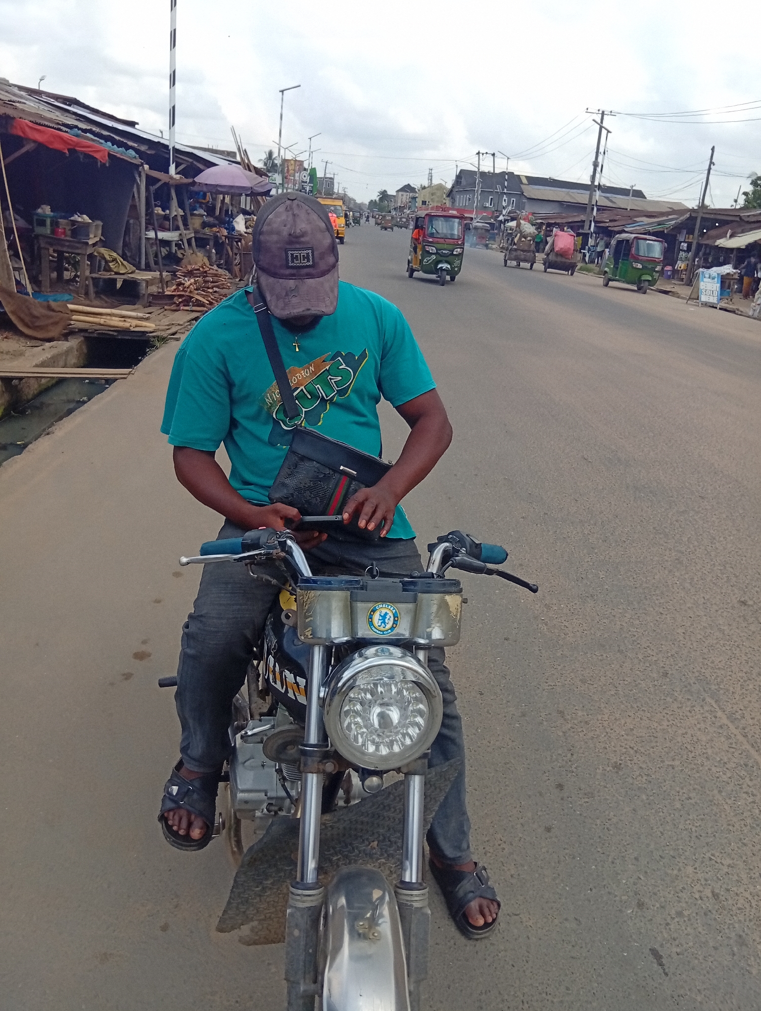 A male individual is observed seated on a black motorcycle, positioned on an asphalt road in Umuode, Nigeria. He wears a teal t-shirt, dark baseball cap, dark trousers, and black sandals, with a black cross-body bag featuring a red and green stripe across his chest. A gold cross pendant is visible. Both hands are engaged with a dark-colored smartphone, at which he is looking down. The motorcycle features a chrome headlight with a textured lens, silver handlebars with blue grips, and a "CHELSEA FOOTBALL CLUB" sticker on the headlight housing. To the right of the motorcycle, a concrete drainage ditch runs parallel to the road, followed by a row of makeshift market stalls constructed from wood and corrugated metal, displaying various goods including bundled wood. A purple umbrella is visible among the stalls. Beyond this, a light-colored utility pole with black and white stripes stands prominently. The road extends into the background, where multiple motorized tricycles (auto-rickshaws/Keke Napep) of green and red colors are present, suggesting traffic flow. Pedestrians are visible near the market area. On the left side of the road in the midground, a large grey building with a dark roof is visible. Overhead, numerous electrical wires traverse utility poles. The sky is overcast and light grey.