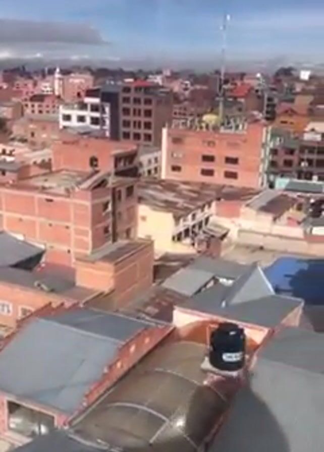 n aerial view of a city. The buildings are predominantly brick, with some having tin roofs. There are water tanks visible on the roofs of some buildings. There is a cell tower situated among the buildings. The sky is blue with scattered clouds.